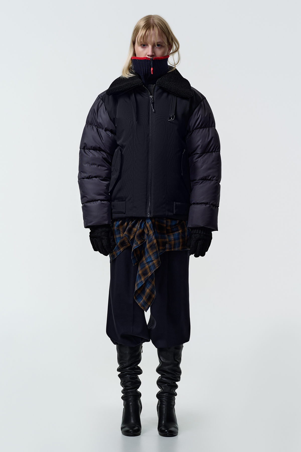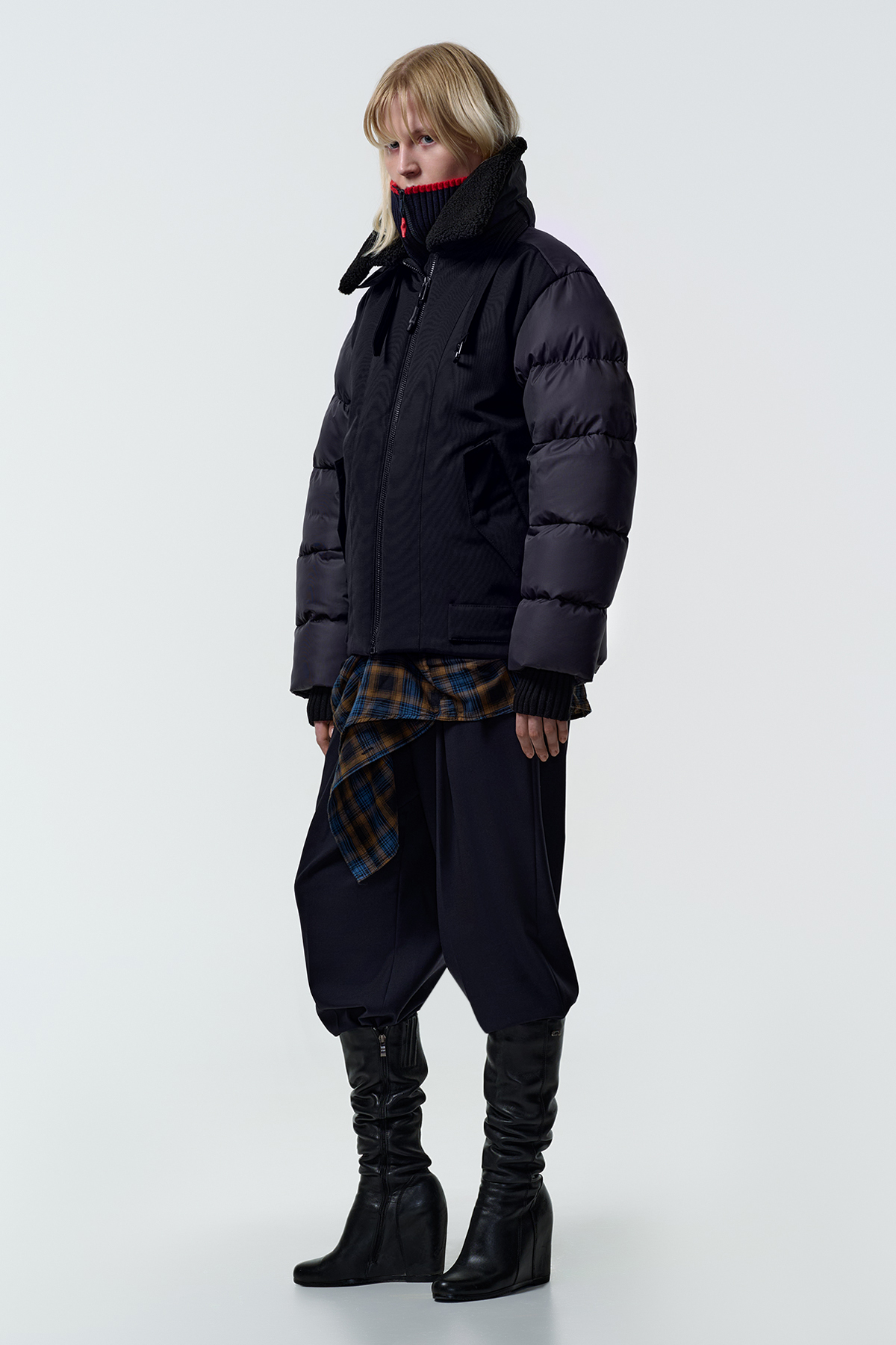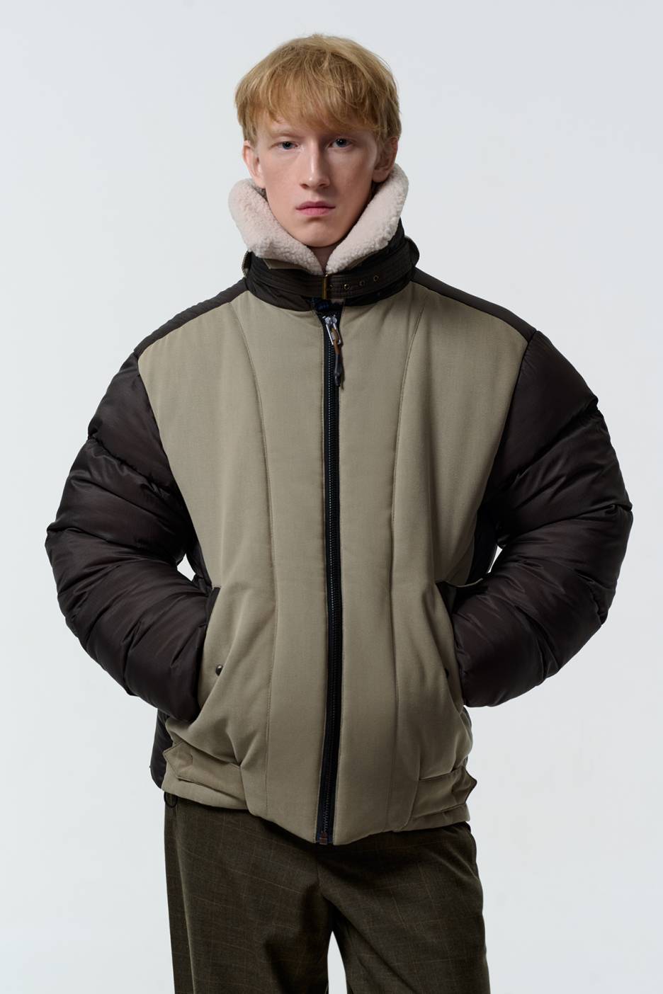 Теплый бомбер из комбинации полиэстера различной плотности - фактурного плотного жаккарда и тонкого рипстоп. Сочетание использовано для баланса тепла веса и гармоничного внешнего вида. В качестве дополнительного утепления в комплекте предлагается съемный воротник из искусственного меха. Классический прямой крой. Отложной рубашечный воротник выполнен из отделочной ткани и снабжен ремешком - функциональной деталью для дополнительной защиты от ветра. Карманы с клапаном и внутренними кнопками. Бомбер застегивается на металлическую молнию. Внизу изделия предусмотрены шлевки для регулировки прилегания по бедрам. На подкладке обработаны два внутренних кармана.