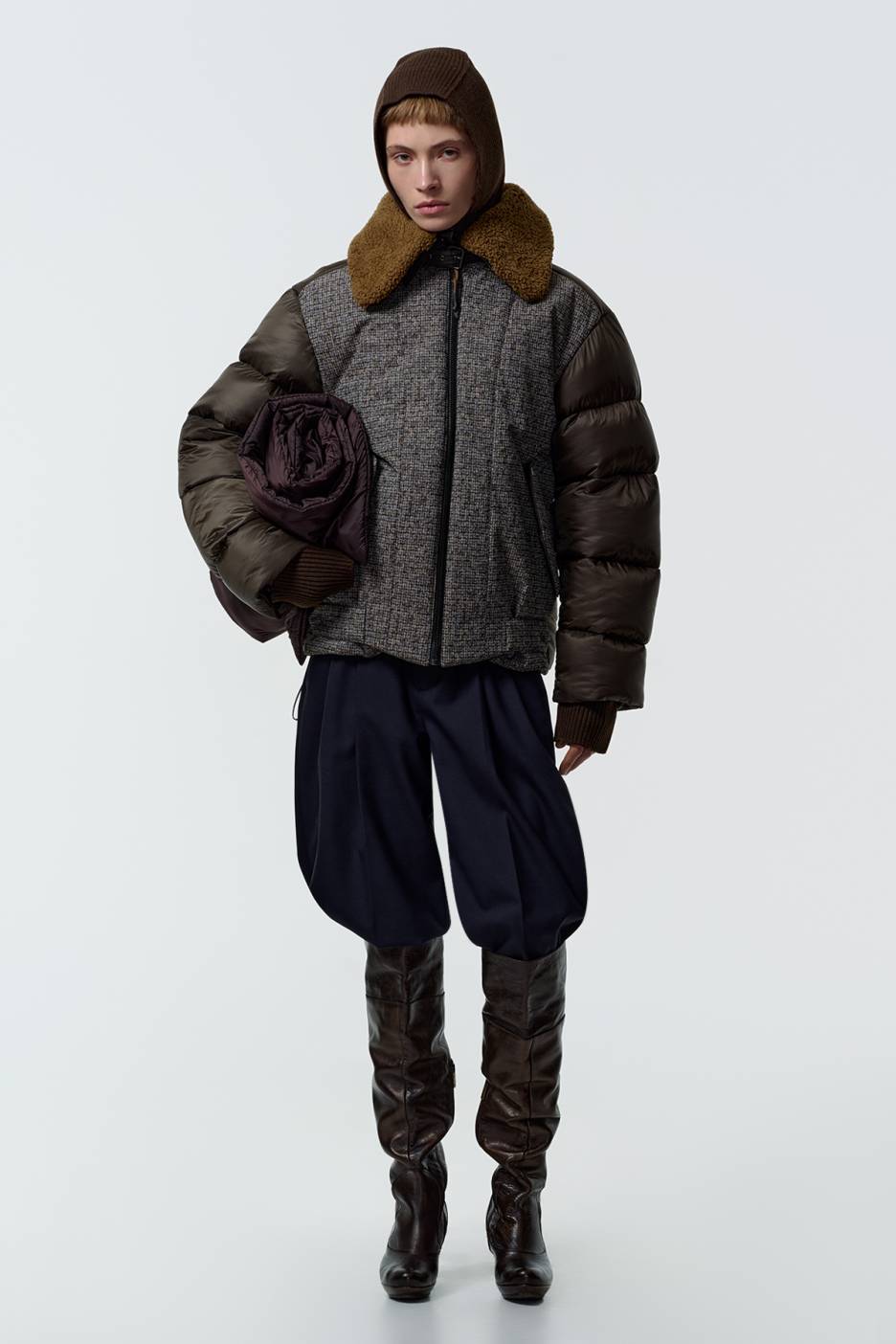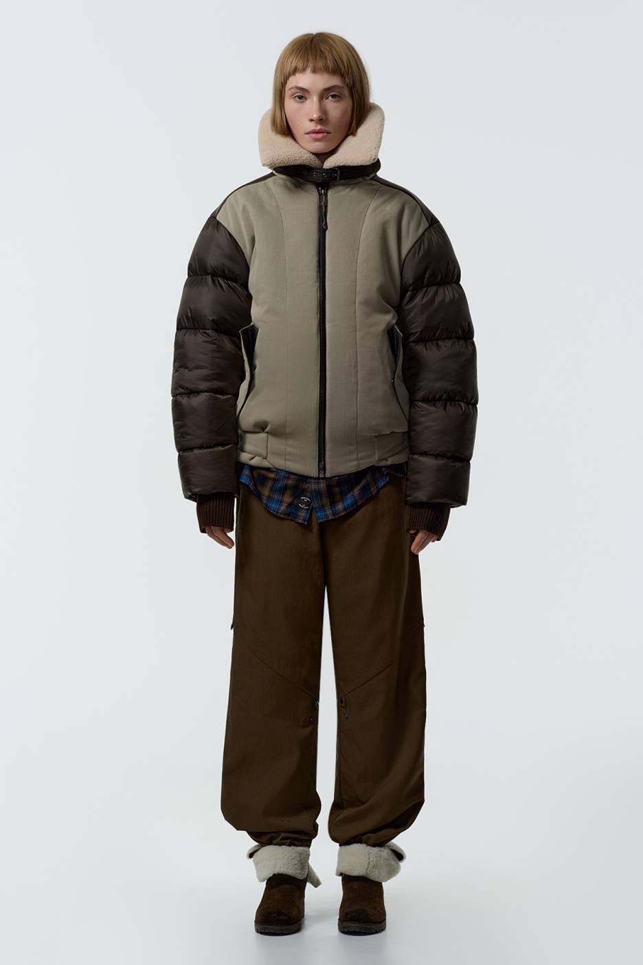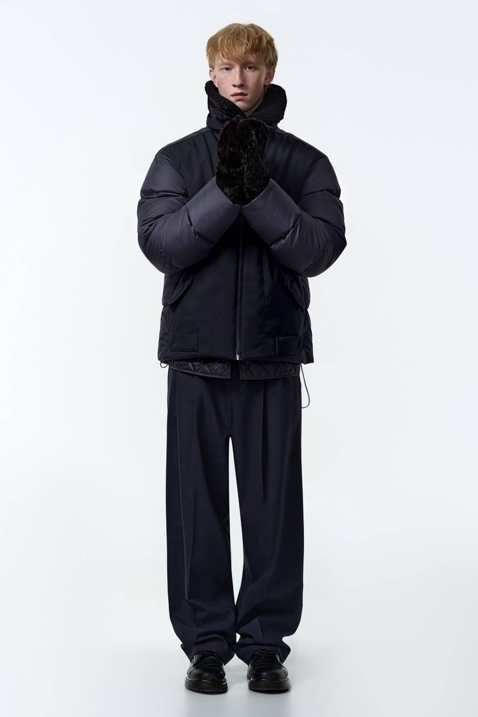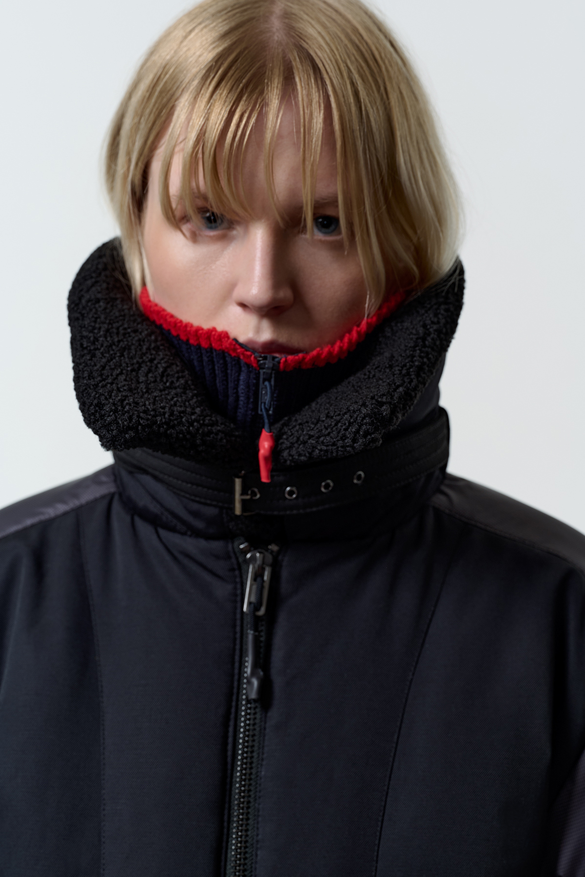 Теплый бомбер из комбинации полиэстера различной плотности - фактурного плотного жаккарда и тонкого рипстоп. Сочетание использовано для баланса тепла веса и гармоничного внешнего вида. В качестве дополнительного утепления в комплекте предлагается съемный воротник из искусственного меха. Классический прямой крой. Отложной рубашечный воротник выполнен из отделочной ткани и снабжен ремешком - функциональной деталью для дополнительной защиты от ветра. Карманы с клапаном и внутренними кнопками. Бомбер застегивается на металлическую молнию. Внизу изделия предусмотрены шлевки для регулировки прилегания по бедрам. На подкладке обработаны два внутренних кармана.